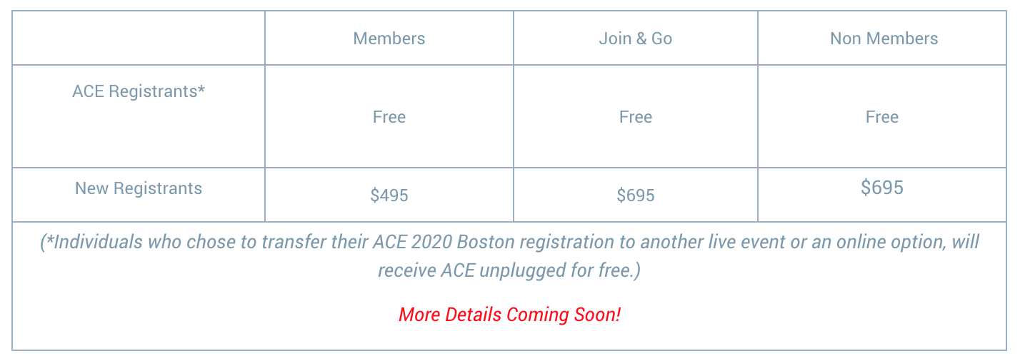 *Individuals who chose to transfer their ACE 2020 Boston registration to another live event in 2020 or to an online option will receive ACE Unplugged for free. (Those who request a refund for ACE will not receive ACE Unplugged for free, but are welcome to purchase) More Details Coming Soon! |